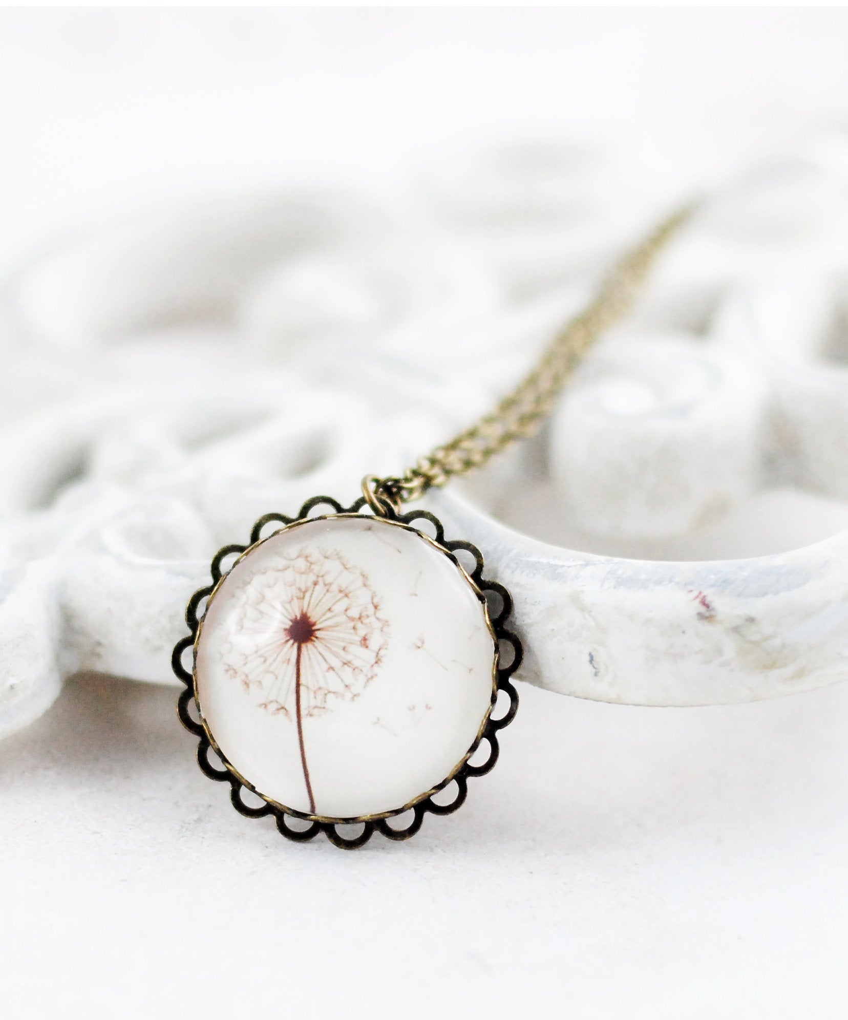 Pusteblumen-Amulett mit Glascabochon und fein verzierter Fassung, angehängt an feines Bronzegliederkettchen mit Karabinerverschluss.