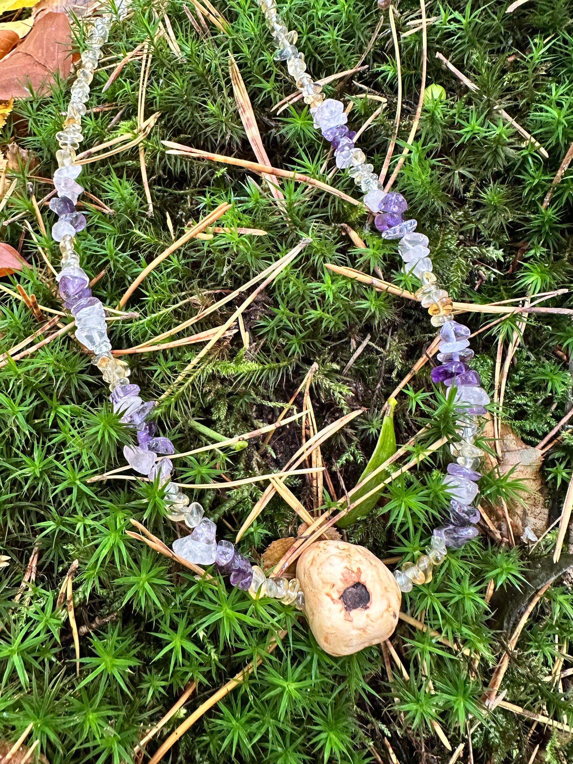 Ihre Energie ist sanft, zart und herzverbunden - wie ein leiser Schutzmantel aus Licht und Liebe. Zarte Rosenquarze schenken Geborgenheit und öffnen das Herz für Mitgefühl. Der Amethyst bringt Ruhe und Klarheit, während Ametrin das Gleichgewicht zwischen Licht und Schatten wahrt. Und der Citrin erinnert mit seinem warmen Leuchten, dass Freude und Vertrauen die beste Form von Schutz sind.