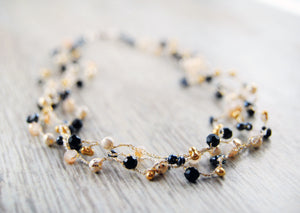 Elegant-opulente Collier-Kette, in präziser und filigraner Häkeltechnik gefertigt. Neben hochwertigen Glaswachsperlen wurden feuerpolierte böhmische Perlen, Mini-Farfalle und hochwertiges Schmuck-Garn in der Farbe Gold und Schwarz/Anthrazit verwendet. Der Karabinerverschluss ist versilbert. Das Collier wurde in drei Einzelsträngen gefertigt und ist ein Unikat.