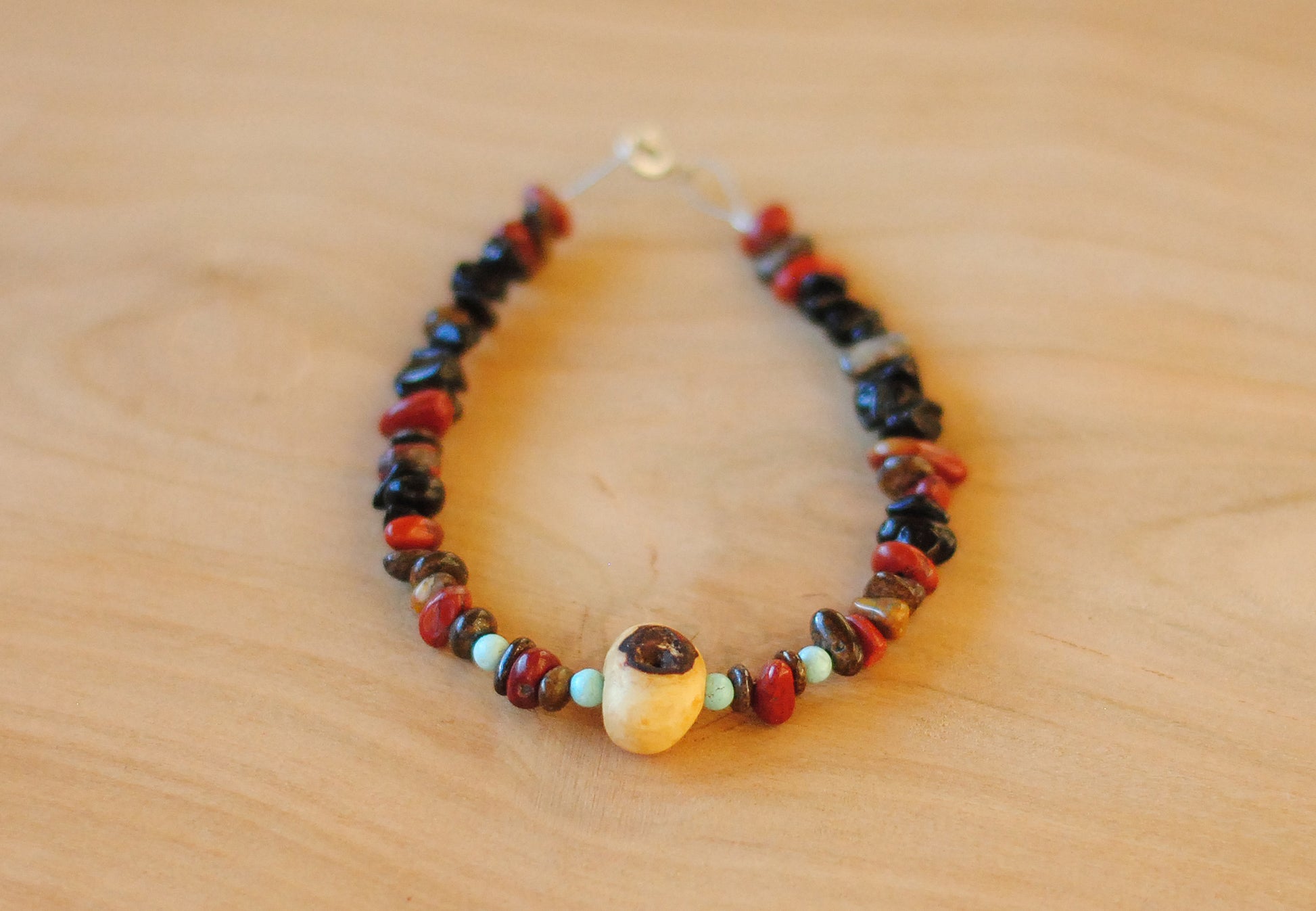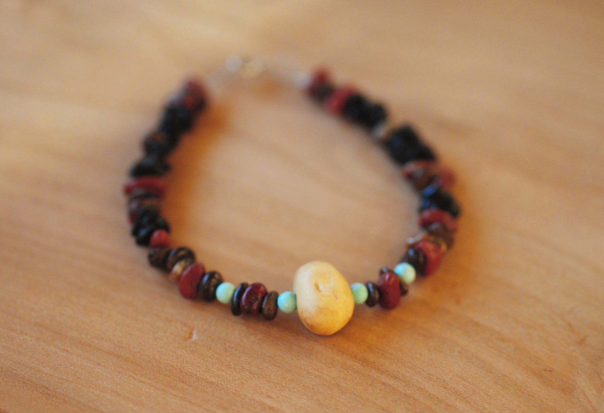 Eine hell-dunkel gezeichnete Baumperle der Rotbuche ist das Herzstück dieses Armbands zum Thema "Erdung" und wird von zwei kleinen leuchtend grün-blauen Türkisen umrahmt.