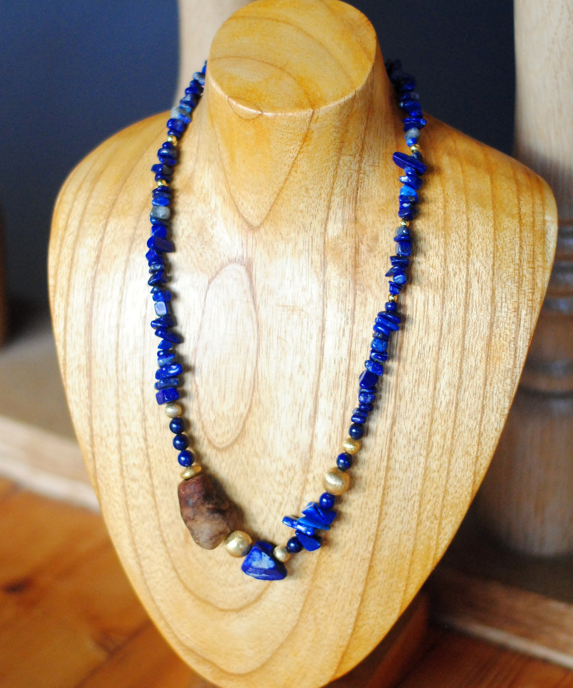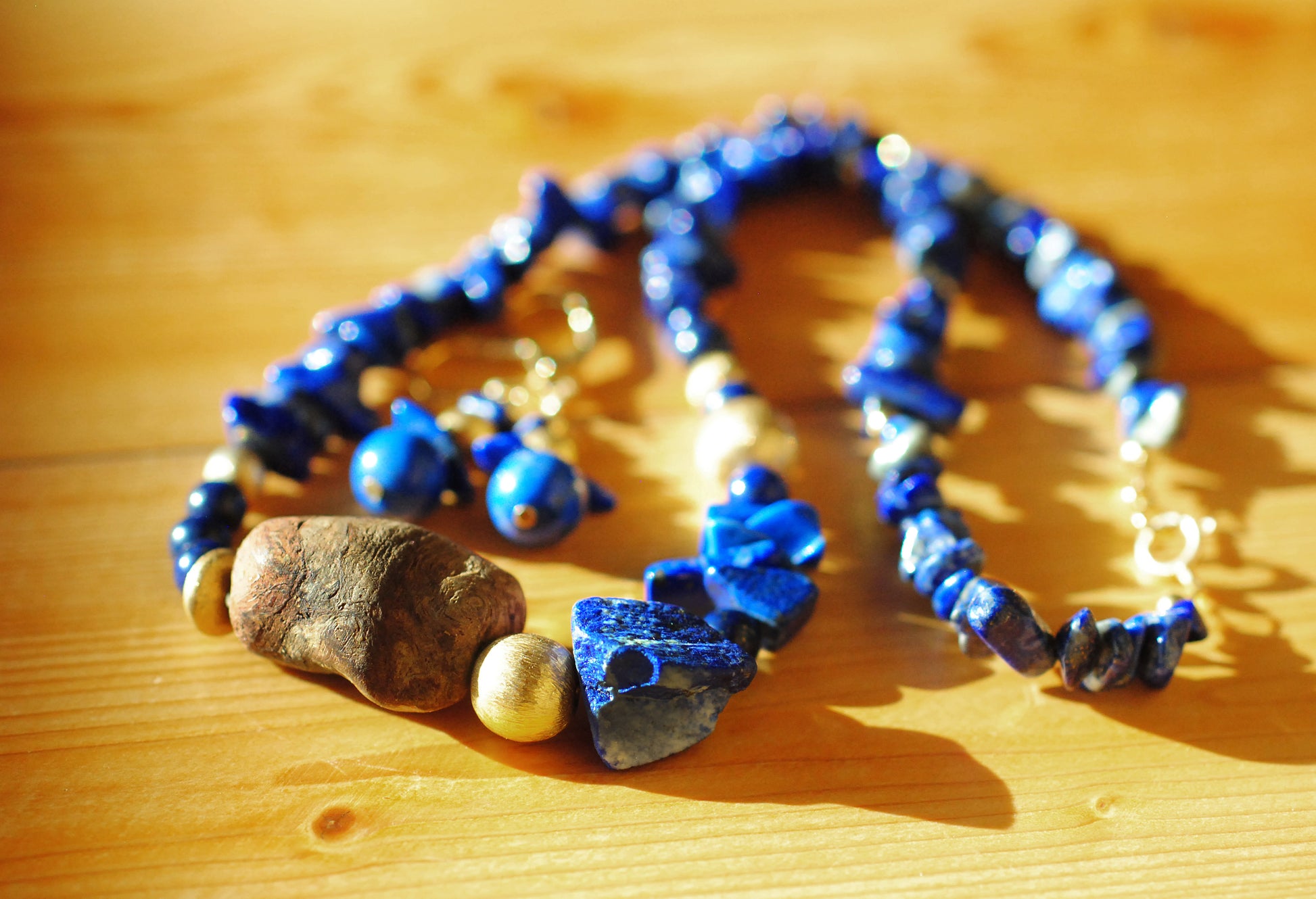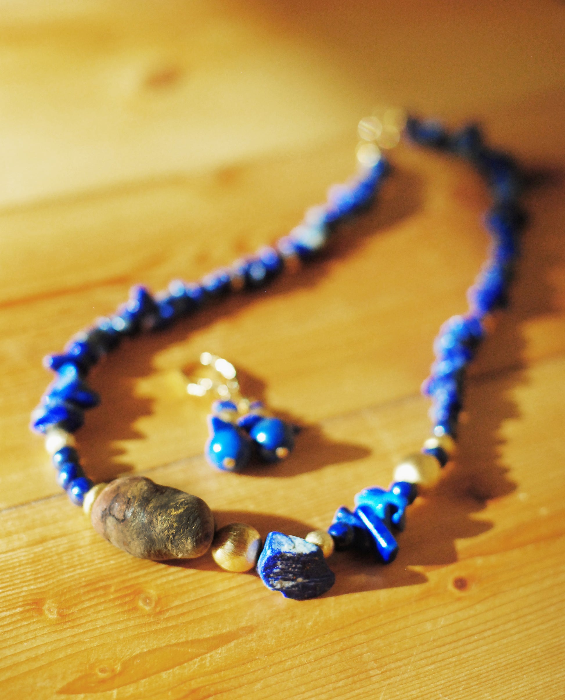 Das leuchtende Dunkelblau vom edlen Lapislazuli ist bei genauerem Hinsehen durchsetzt von kleinen Goldsprenklern. Vergoldete Perlen umrahmen die wertvollen Steine.