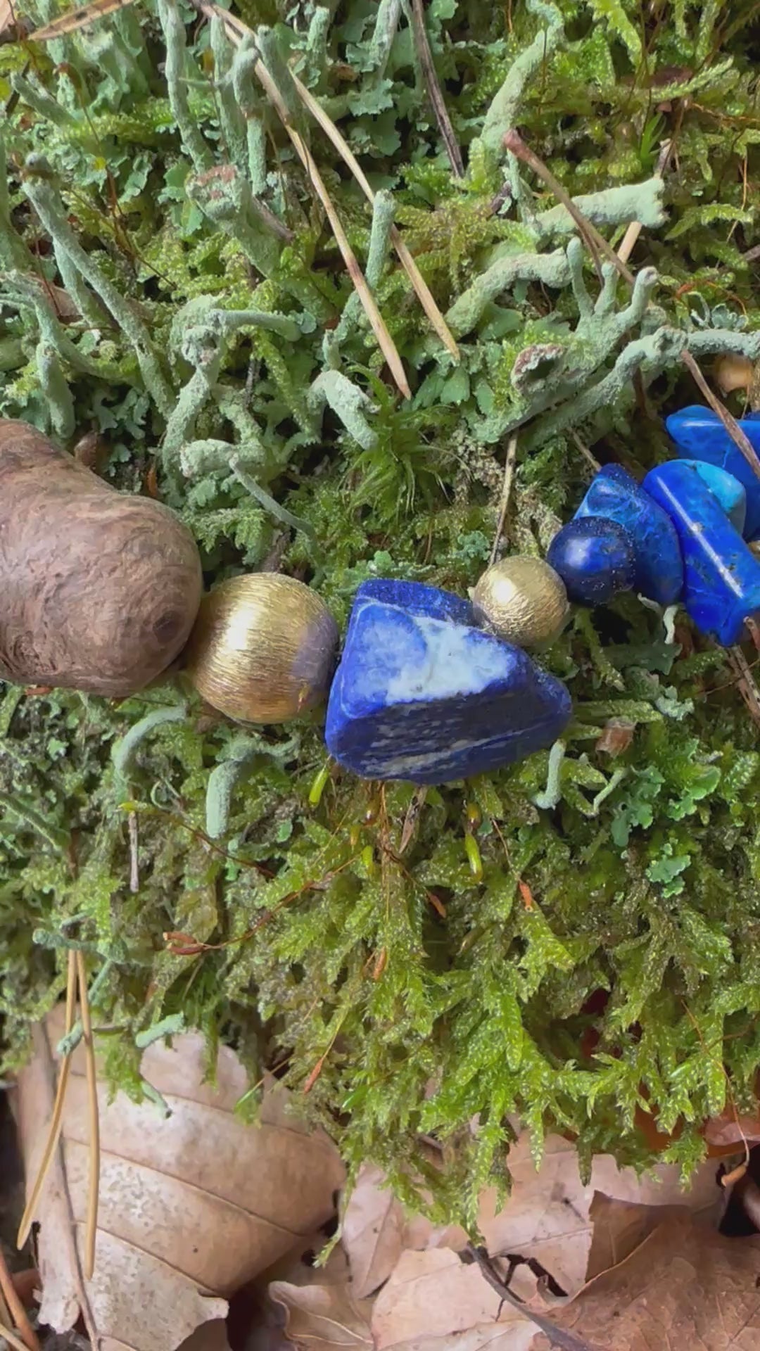 Der Lapislazuli, Stein der Wahrheit und inneren Weisheit, zeigt sich hier in seiner ganzen Intensität: tiefblau wie ein nächtlicher Himmel, durchzogen von feinen goldenen Adern, die an Sterne erinnern: Die Fülle des Universums.