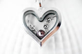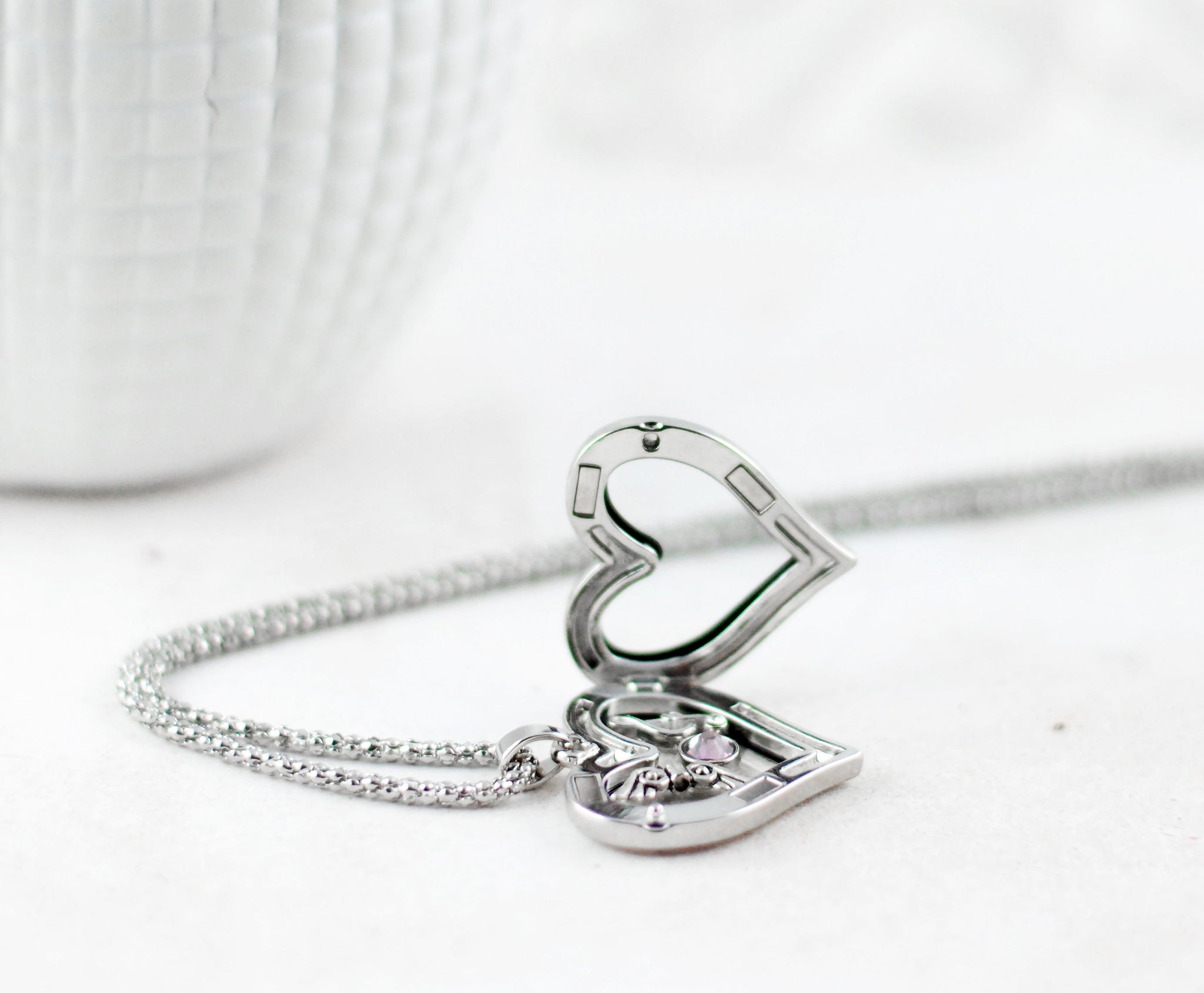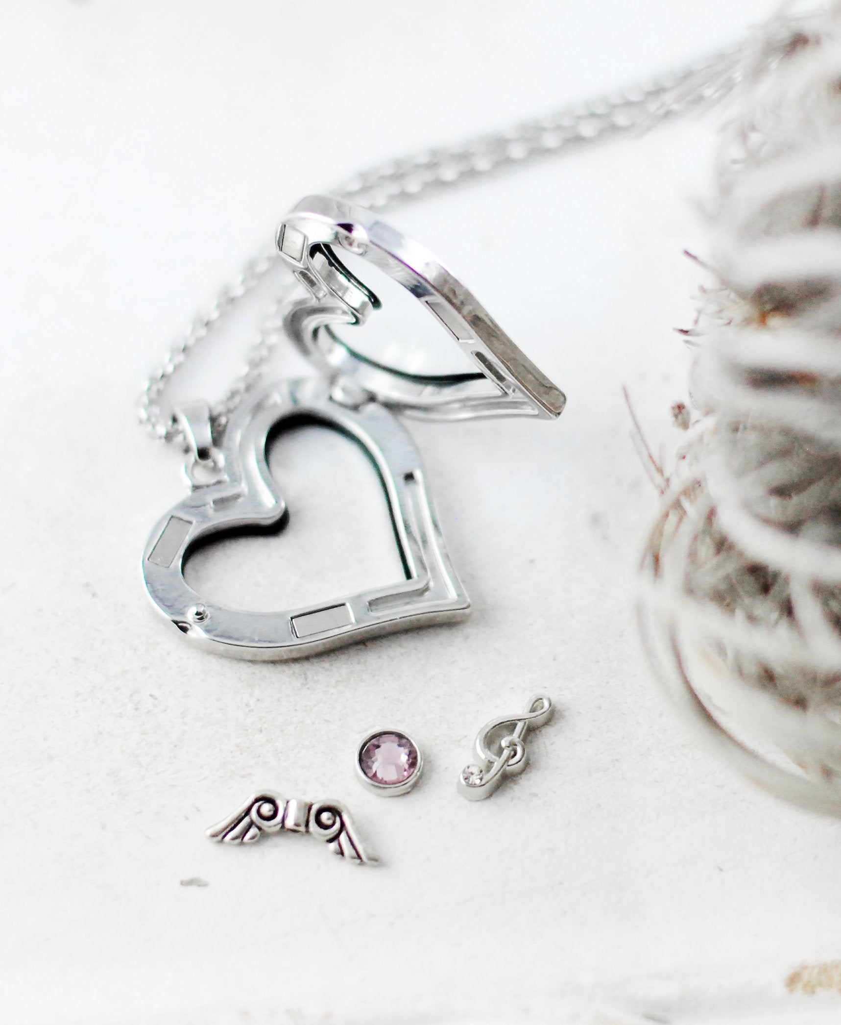 Herzmedaillon, gefüllt mit Charms (Flügel, Kristall in zartem Rosa, Notenschlüssel mit kleinem weißen Kristall), hochwertige Edelstahlkette mit Karabinerverschluss