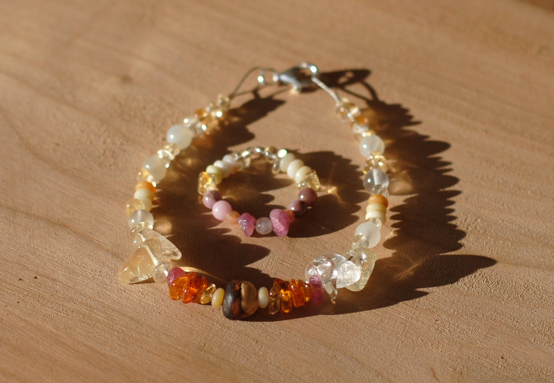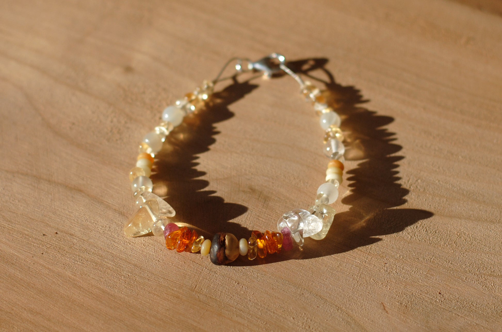 Warme Farbtöne des Citrins und Bernsteins sowie pinker Turmalin und heller Mondstein runden das Armband farblich ab. Folgende hochwertigen Edelsteine und Schmuck-Komponenten wurden liebevoll zusammen gestellt und vereint:
