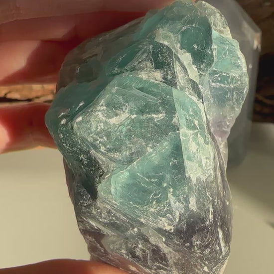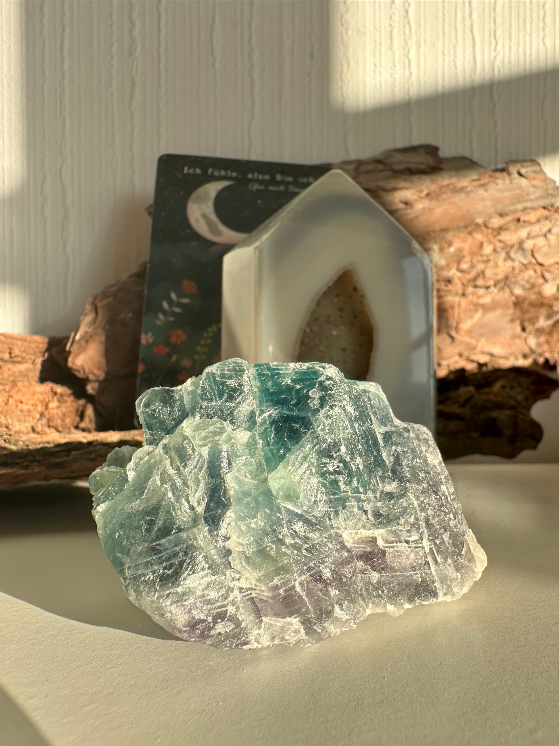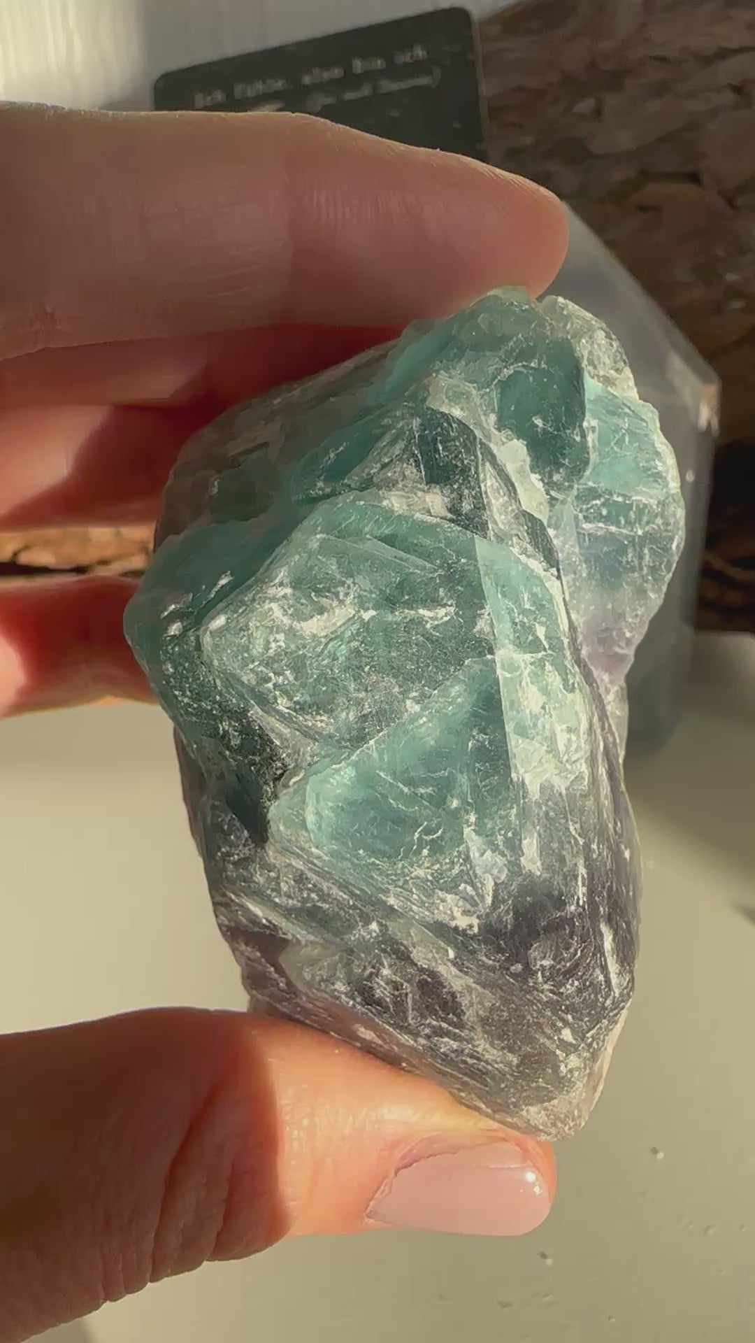 Dieser Fluorit-Rohstein zeigt seine natürliche Farbvielfalt in violetten und grünen Nuancen. Fluorit wird häufig mit Klarheit, Struktur und geistiger Ordnung in Verbindung gebracht. Als Rohstein bewahrt er seine ursprüngliche, unverarbeitete Form und Ausstrahlung. Er eignet sich gut als Sammlerstück, zur Raumgestaltung oder für meditative Zwecke. Du bekommst genau diesen auf den Fotos abgebildeten Stein.