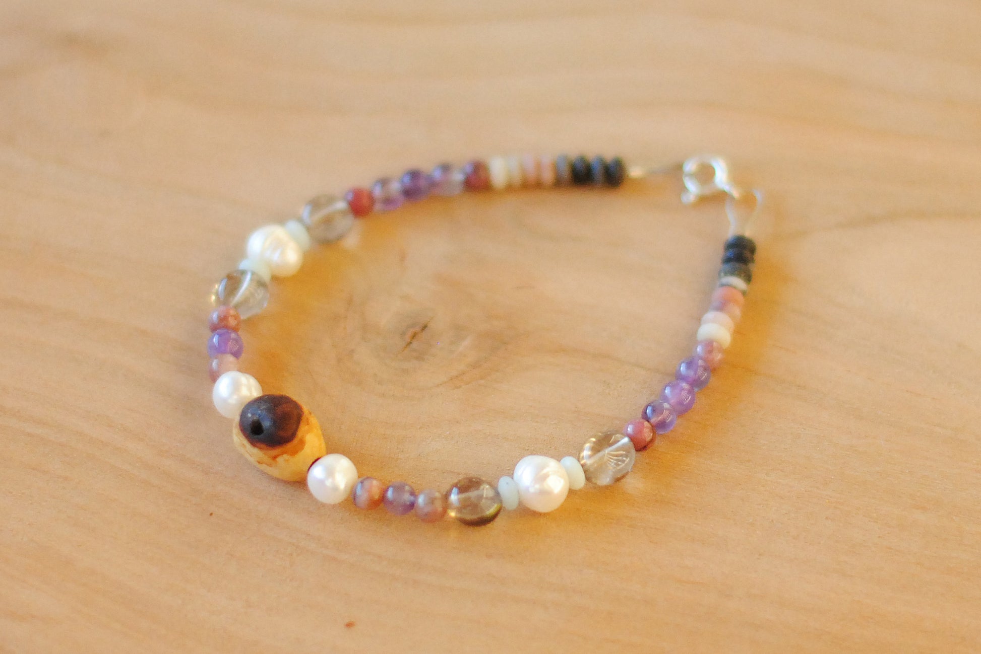 Zarte Farbtöne des Amazonits, des Amethysts, des Rhodonits und des Rauchquarzes umrahmen in diesem Armband das sanfte Schillern der Süßwasserperlen. Folgende hochwertigen Edelsteine und Schmuck-Komponenten wurden liebevoll zusammen gestellt und vereint: