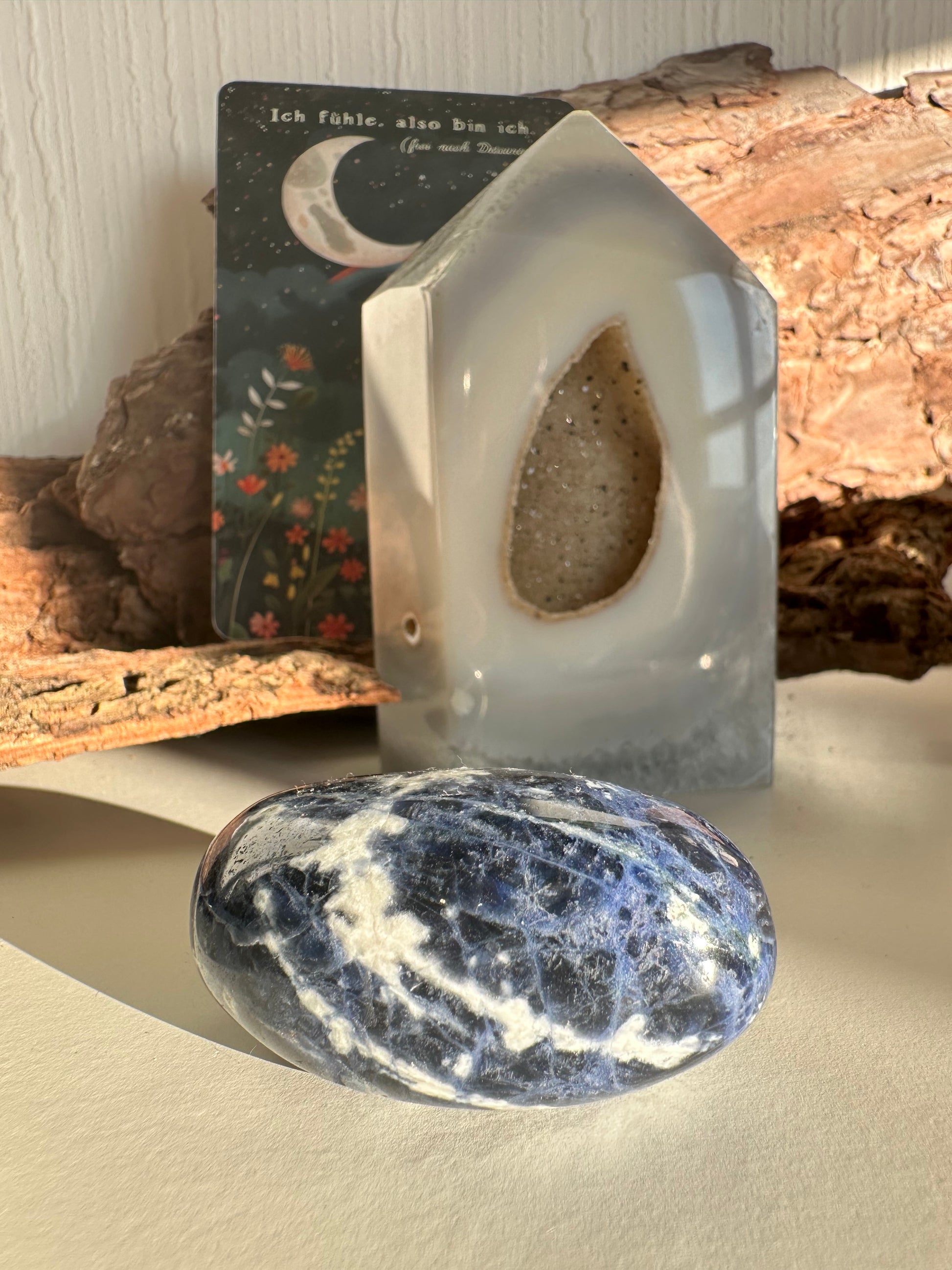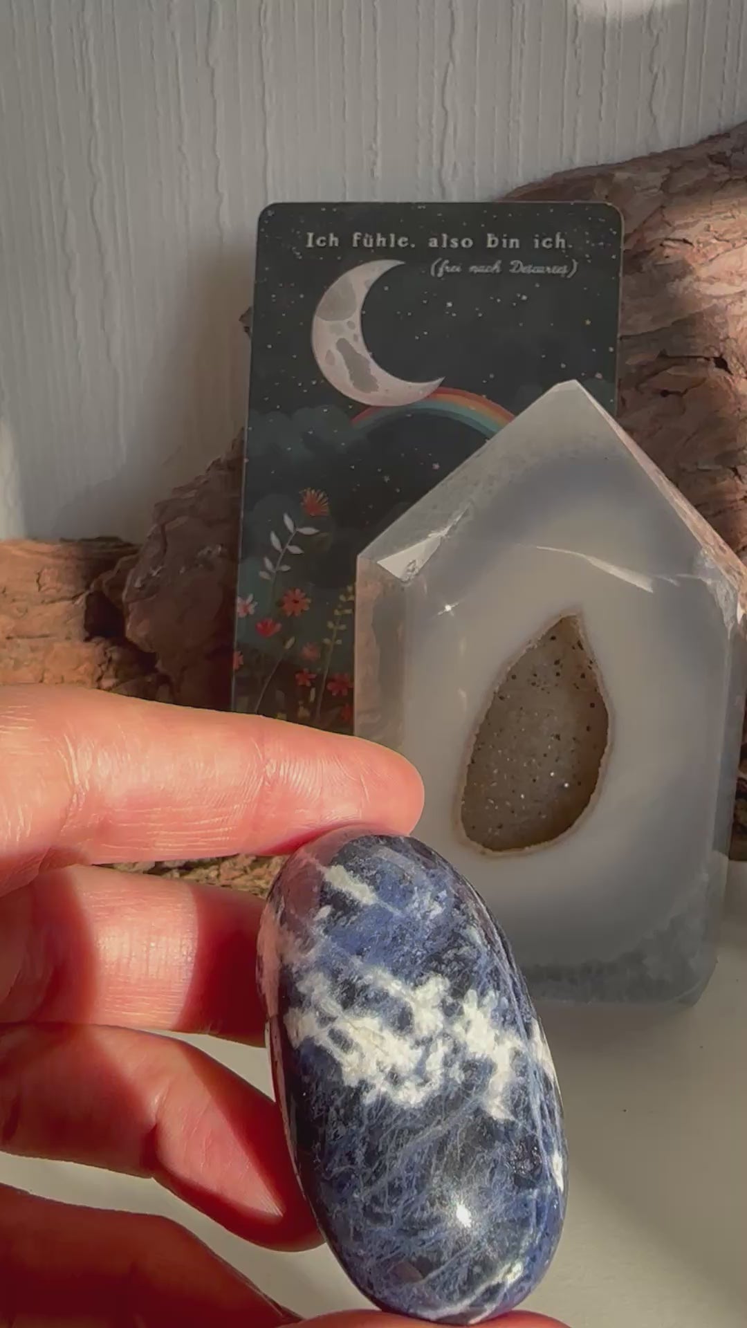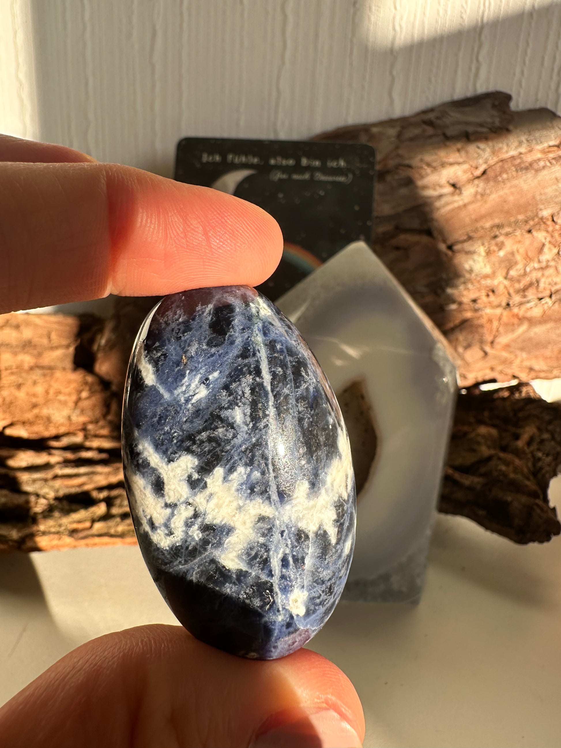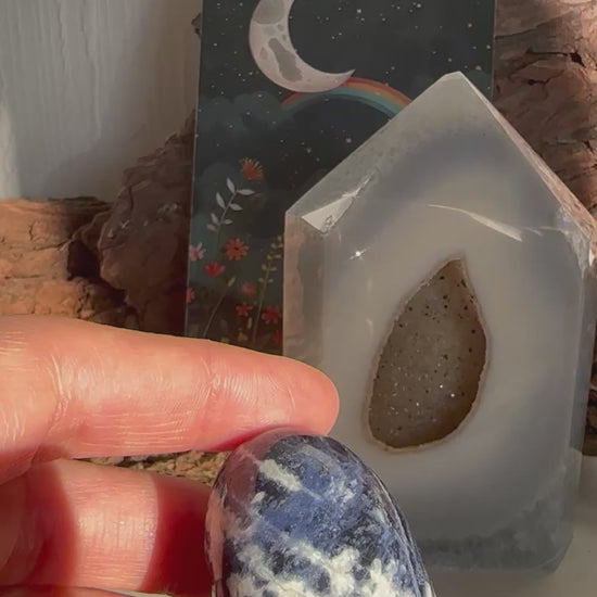Dieser Sodalith-Trommelstein mit einer Größe von ca. 5 cm zeichnet sich durch seine tiefblaue Farbe mit hellen Adern aus. Sodalith wird häufig mit Klarheit, Rationalität und innerer Ruhe in Verbindung gebracht. Durch die Trommelpolitur liegt der Stein angenehm in der Hand und eignet sich gut für den Alltag, zur Meditation oder als Handschmeichler. Er kann natürlich ebenso als dekorativer Stein genutzt werden. Du bekommst genau diesen auf den Fotos abgebildeten Stein.