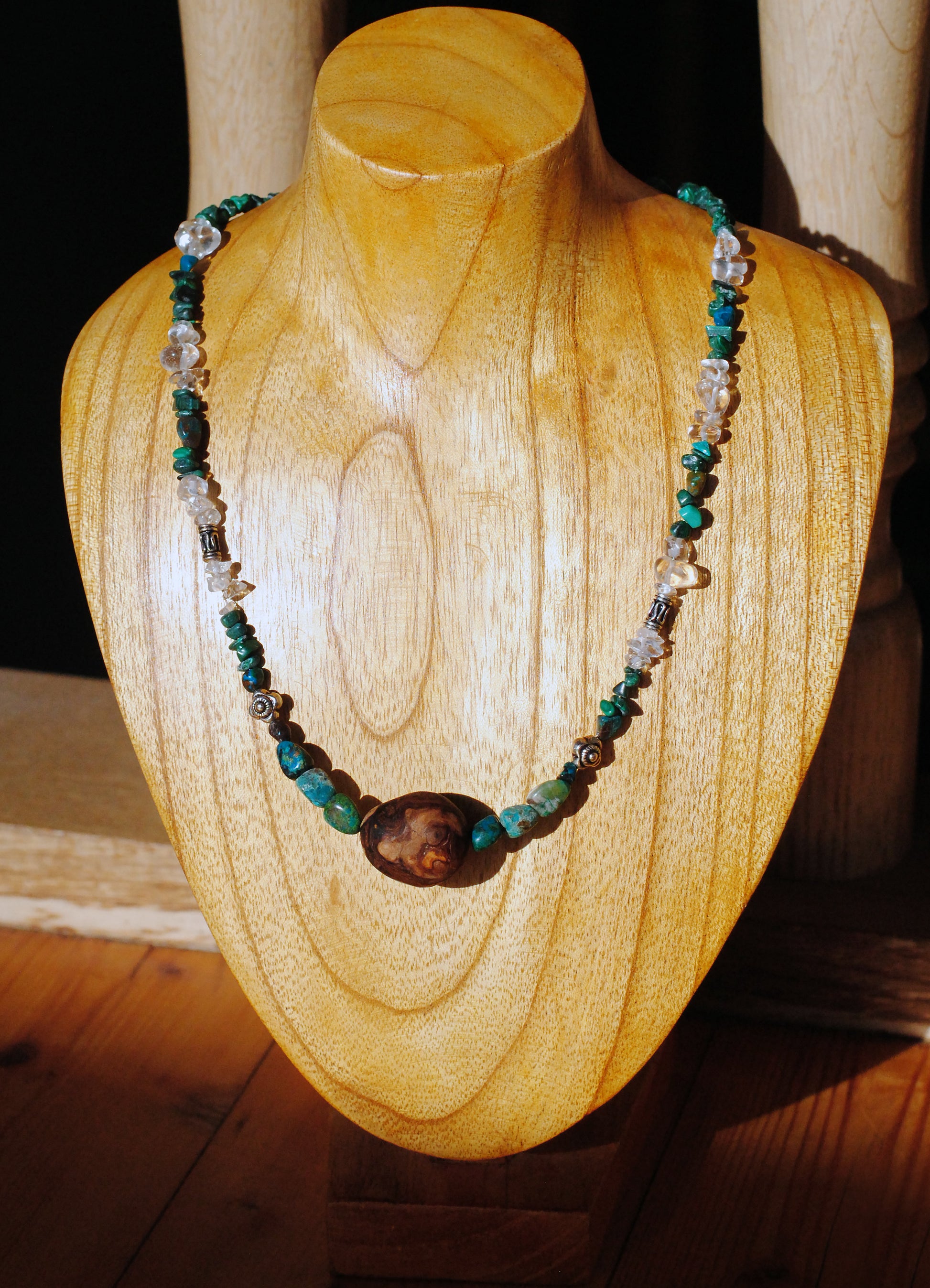 Chrysokoll, Malachit, Bergkristall, Silberelemente, Federringverschluss Silber, Juwelierdraht
